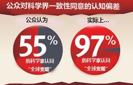 举个例子,大约有97%的科学家认同“全球变暖正在发生”,但是媒体为了客观性,总是给异见观点同样多的报道,“虚假客观性”使得公众以为科学界在这个问题上观点很分裂,认为印象中只有55%的科学家对“全球变暖”有一致观点。如果是这样的结果,公众就不可能在解决全球变暖问题号召中积极行动起来。