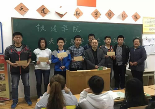 铁道学院领导在班级为同学们发放“天佑助学金”现场并合影留念。