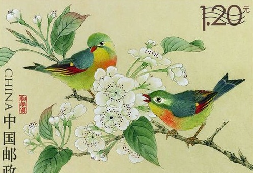邮票画面采用中国画工笔重彩的表现形式,一对相思鸟在梨花间,暗含“成双成对 不离不弃”之意。邮票主体画面色彩典雅、笔法细腻,增加了票面的生动与浪漫感。此次发行的《相思鸟》特种邮票1套1枚,邮票面值1.20元,由喻慧设计,马荣雕刻。