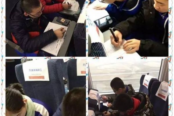 列车上,同学们认真总结研学的收获,互相交流,认真填写研学手册。