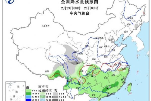 23日08时至24日08时,青海东部、西藏东部、川西高原、安徽西南部、江西北部、浙江西北部等地有小雪或雨夹雪,其中川西高原北部局地有中到大雪;西藏东南部、西南地区东部、云南北部和东部、江南、华南大部等地有小到中雨,其中,云南西北部局地有大雨。(见图1)。黄海大部、东海大部有6~7级、阵风8级的偏北风。