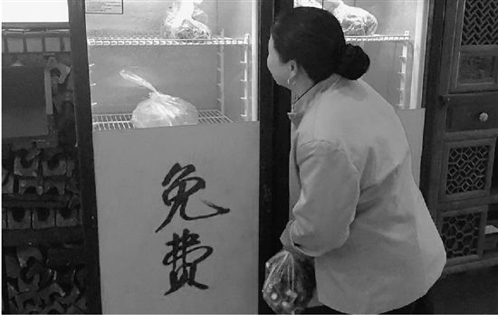 2月21日中午,宁波联盛广场保洁员卞秀珍从“分享冰箱”里拿了一包豆腐,冰箱里的东西都是免费的。