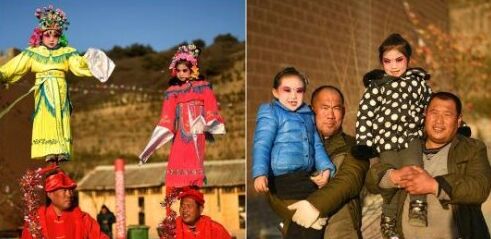 2月10日,山西太原台骀山,来自晋中农村的民间非遗艺人在表演社火前后对比。