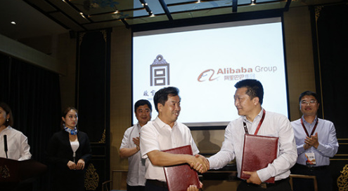 2016年6月,故宫博物院官方旗舰店上线阿里巴巴平台。图为故宫博物院常务副院长王亚民、阿里旅行总裁李少华代表双方签署协议。