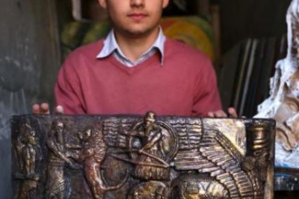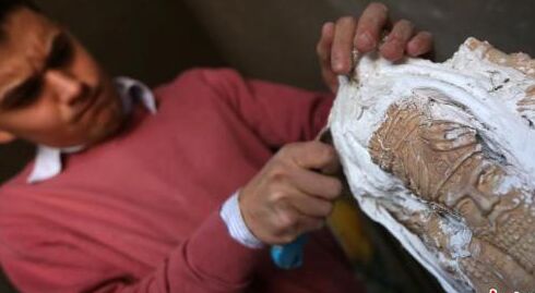 Ninos Thabit展示他复制出来的亚述人遗址雕塑。