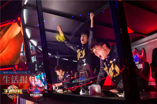 廖飞宇(图中举手者)在比赛胜利后欢呼。网络截图