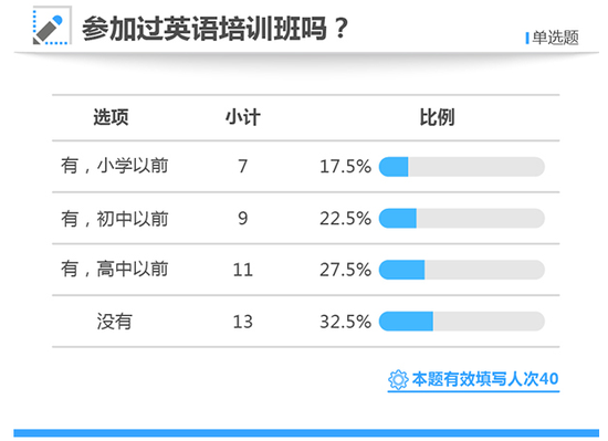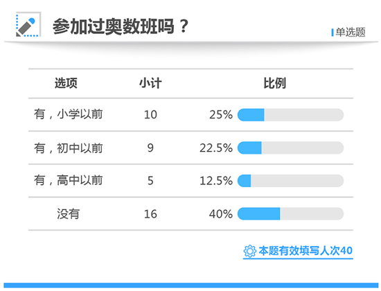 调查问卷表明,有16名状元从没有参加过奥数培训班,占参与调查总人数的40%。而有47.5%的状元仅在初中以前参加过奥数培训。