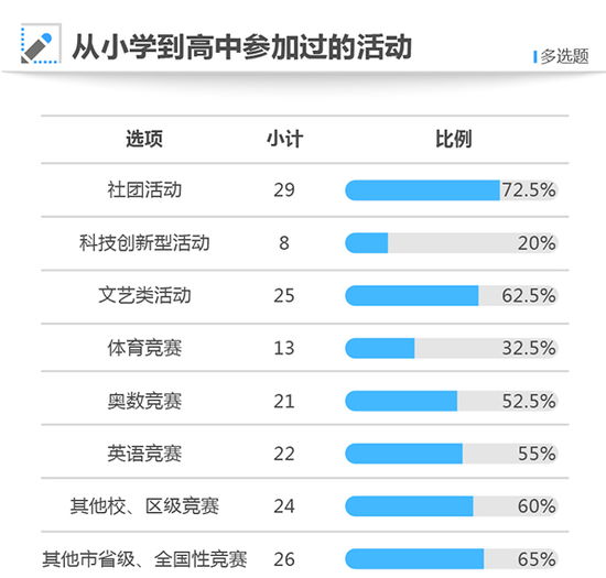 调查问卷显示,除了参与奥数、物理、英语等学科类竞赛,不少状元同时也是文艺、体育、科创类等活动的主力军。40位填写问卷的状元中,有25人参与过文艺类活动,13人参与过体育竞赛,还有8人参加过科技创新活动。