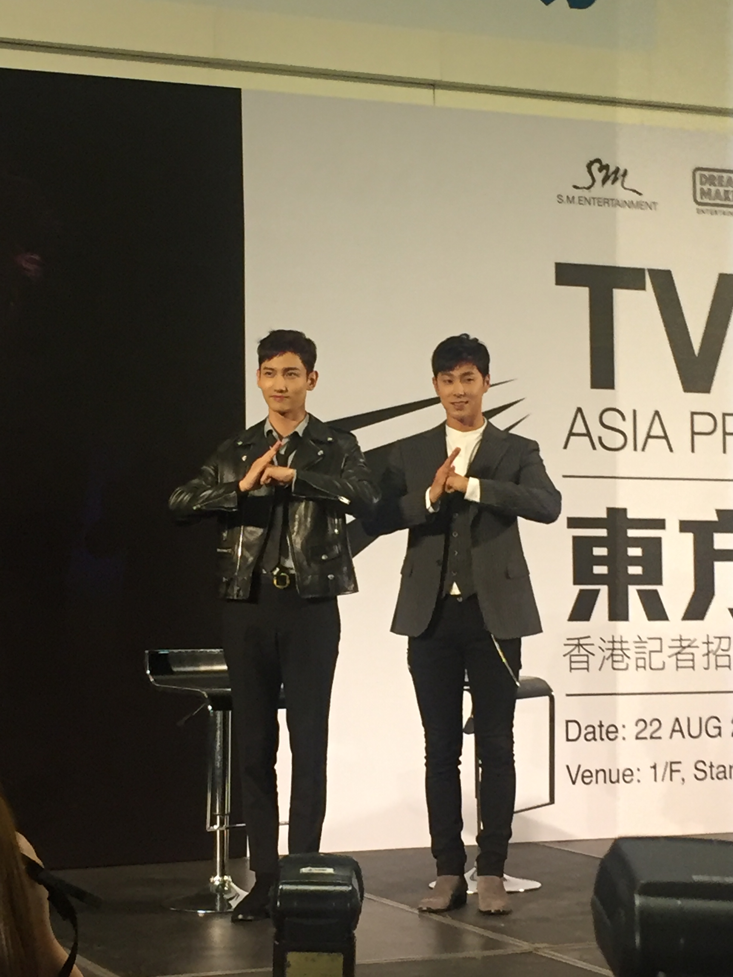 郑允浩一身竖条纹西服斯文亮相,沈昌珉身着皮衣帅气有型。开场两人分别用广东话向现场粉丝打招呼,并透露打算在香港开演唱会,瞬间将现场气氛推到高潮。