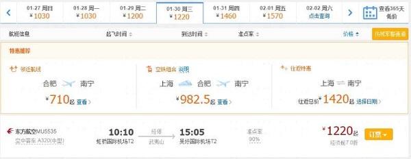 而且,由于春运期间机票多为全价票,“空铁联运”产品在价格上也更具优势。以1月30日从上海往南宁方向为例,当天直飞机票的最低价为1220元,而从上海先坐火车去合肥再飞南宁,火车票+机票最低价仅为982.5元,比直飞的票价便宜了237.5元。