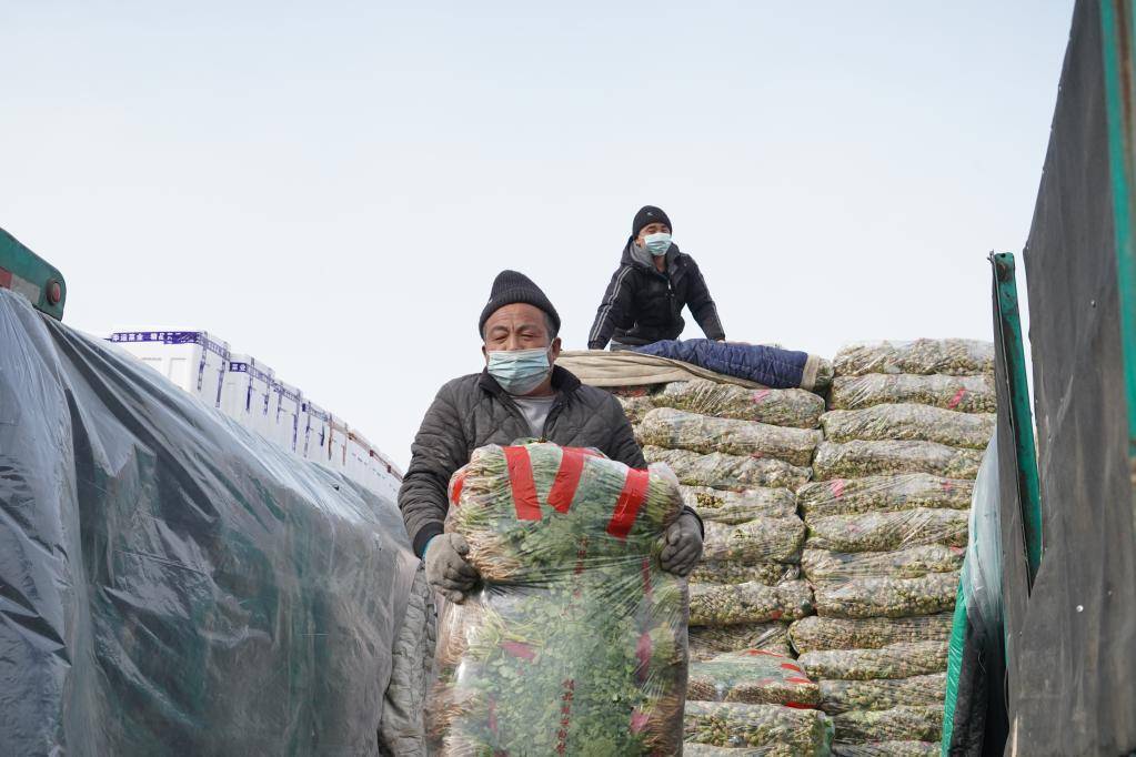 3月28日,哈尔滨龙园农产品批发市场,经销商在严格落实疫情防控规定的前提下整理货品。新华社记者 魏弘毅 摄