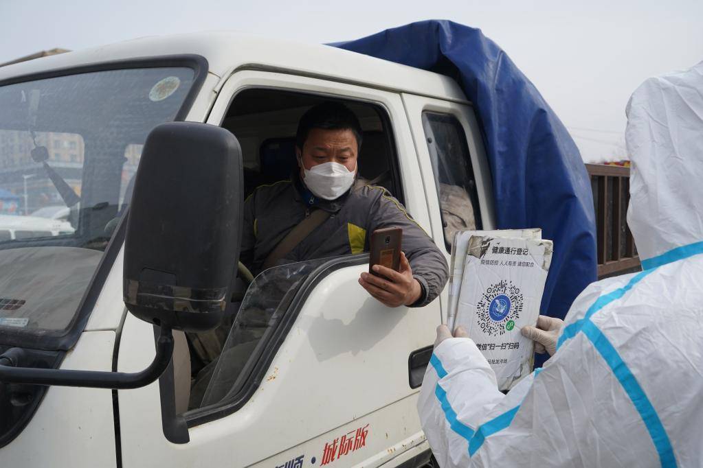 3月28日,哈尔滨龙园农产品批发市场,防疫人员正在进行出入登记。新华社记者 魏弘毅 摄