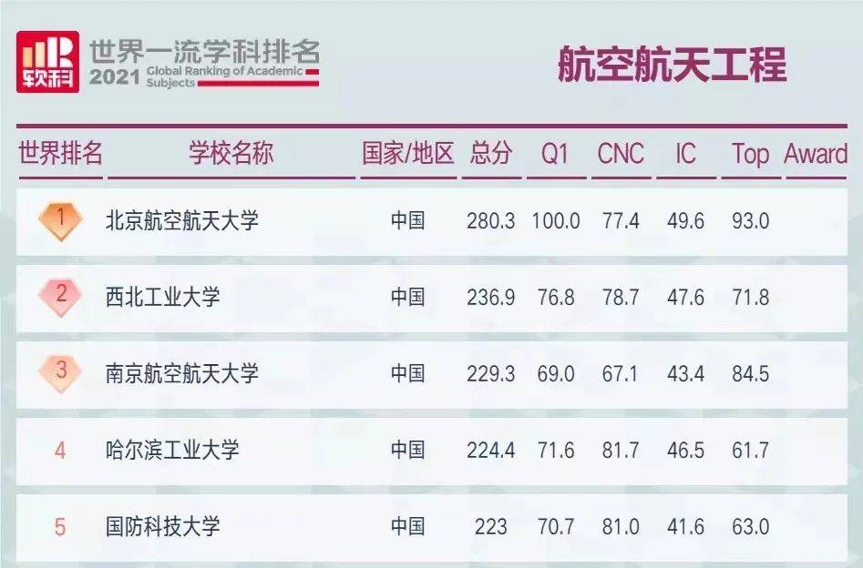 在2021软科世界一流学科排名航空航天工程学科排名中,全球共有50所高校上榜,排名全球前5的高校均为中国高校,分别为北京航空航天大学、西北工业大学、南京航空航天大学、哈尔滨工业大学、国防科技大学。充分体现我国航空航天实现跨越式发展背后学科建设的牢固“根基”。