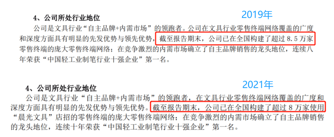 行至当下,晨光股份的这部分业务开始面临增长“乏力”的问题。这一点可以从门店数量上看出。截至2021年底,晨光股份在全国拥有36家一级合作伙伴、覆盖1200个城市的二、三级合作伙伴和大客户,超8万家使用“晨光文具”店招的零售终端。但在2019年,其零售终端尚且还有8.5万家——近几年不但没有增长,还因为疫情出现了一定的下滑。