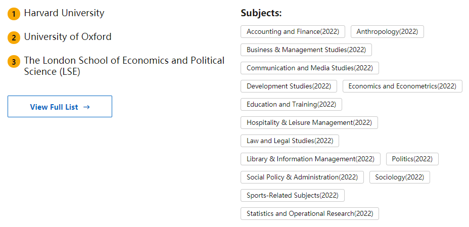 值得注意的是,本次Arts and Humanities领域排名前10的学校中,第1、第2、第9名分别是英国的牛津大学、剑桥大学和爱丁堡大学,其余7席均为美国大学。