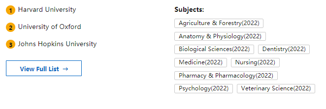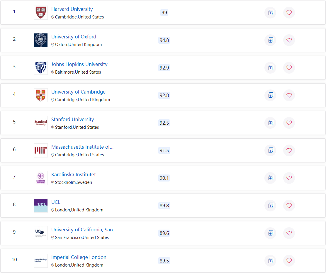 前十分别为哈佛大学、牛津大学、约翰霍普金斯大学、剑桥大学、斯坦福大学、麻省理工学院、卡罗林斯卡学院、伦敦大学学院、加州大学旧金山分校、帝国理工学院。