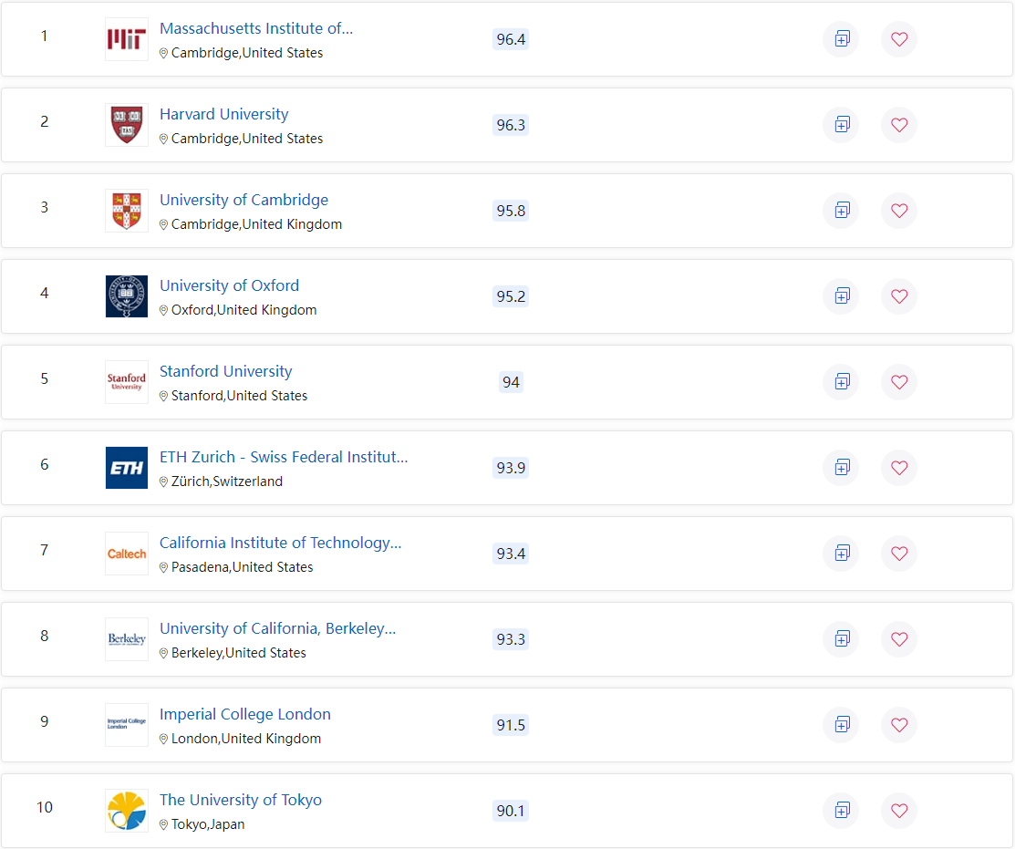 分别为麻省理工学院、哈佛大学、剑桥大学、牛津大学、斯坦福大学、苏黎世联邦理工学院-瑞士联邦理工学院、加州理工学院、加州大学伯克利分校、帝国理工学院、东京大学。