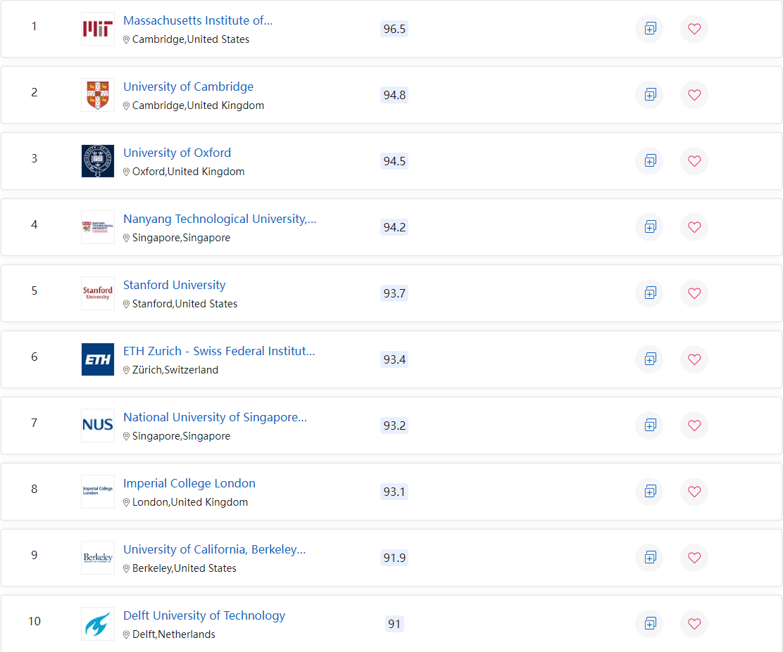 在Engineering and Technology领域的排名中,美国共有3所大学进入前十,分别是第一名麻省理工学院、第五名斯坦福大学、第九名加州大学伯克利分校。