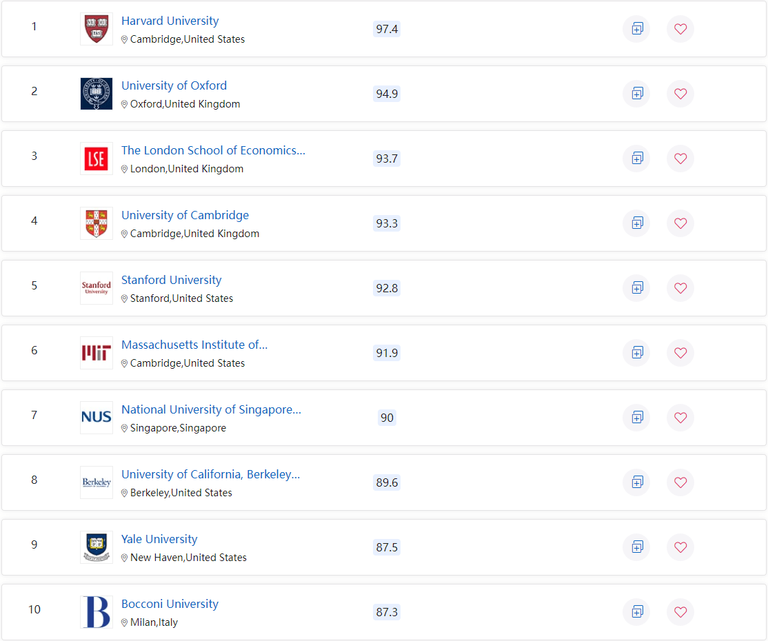 这十所大学分别为哈佛大学、牛津大学、伦敦政治经济学院、剑桥大学、斯坦福大学、麻省理工学院、新加坡国立大学、加州大学伯克利分校、耶鲁大学、博科尼大学。