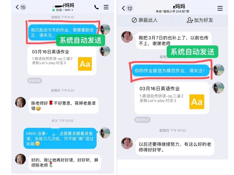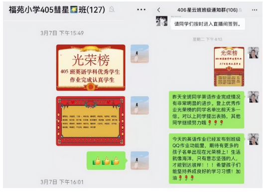当然,课堂作业是面向全班同学的,也需要教师进行集体评价。有时候直接的“一对一”评价过于严厉,就需要“一对多”的集体评价达到激发部分学生学习行为的目的,为此,我们采用在线及时评价和“延期”总体评价相结合的灵活多元的评价方式。比如利用“班级圈”(比如家长群)开展线上英语学习任务个人点评和集体点评,当每个学生将自己的英语学习任务发到“班级圈”时,“班级圈”内所有成员都可以互相查看,互相评改,教师评价的鼓励、提醒功能就有了事半功倍的效果。