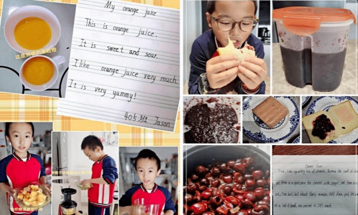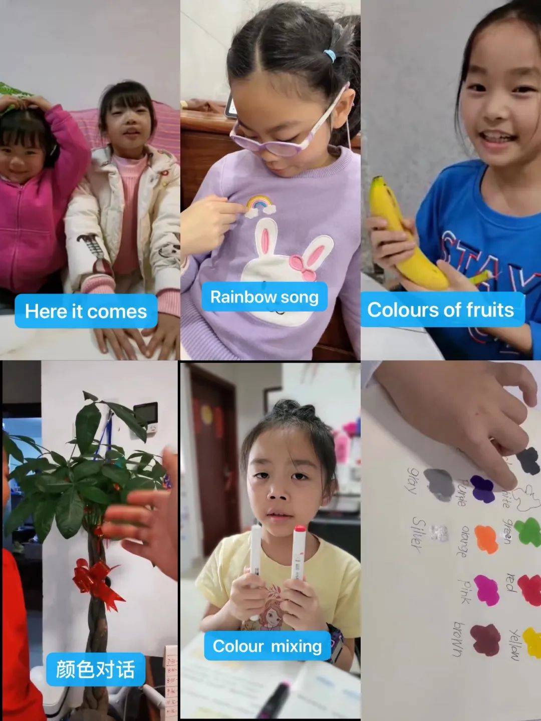 除此以外,在平时的线下教学中,受限于时间、目标和素材等各种因素的影响,教师更多注重的是对英语能力的培养,而对学生的思维和兴趣的培养却有所忽视。在线教学的居家环境恰好给动手实践作业提供了一个平台,可以让学生在体验中感受英语学习的乐趣。比如,二年级老师在教授2B Unit 1 What can you see时,尝试让学生动手进行《彩虹水杯桥》(Walking Rainbow Experiment)的实验,使学生在科学实验中体会到色彩的混合变化。
