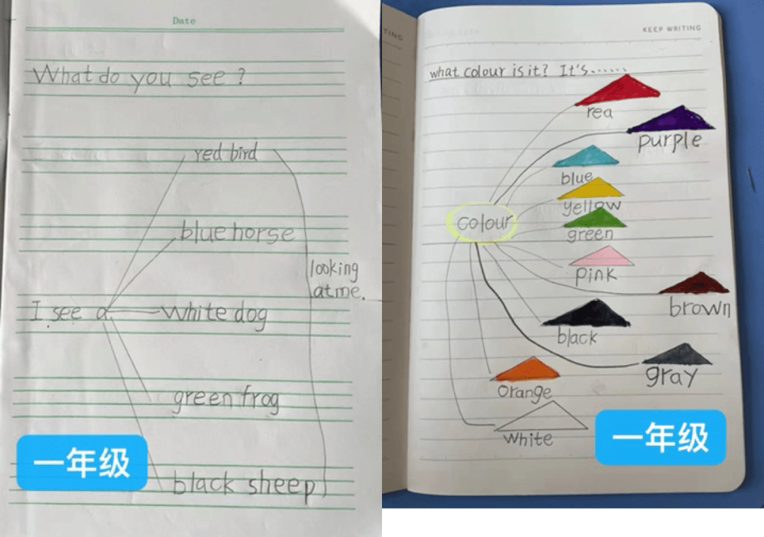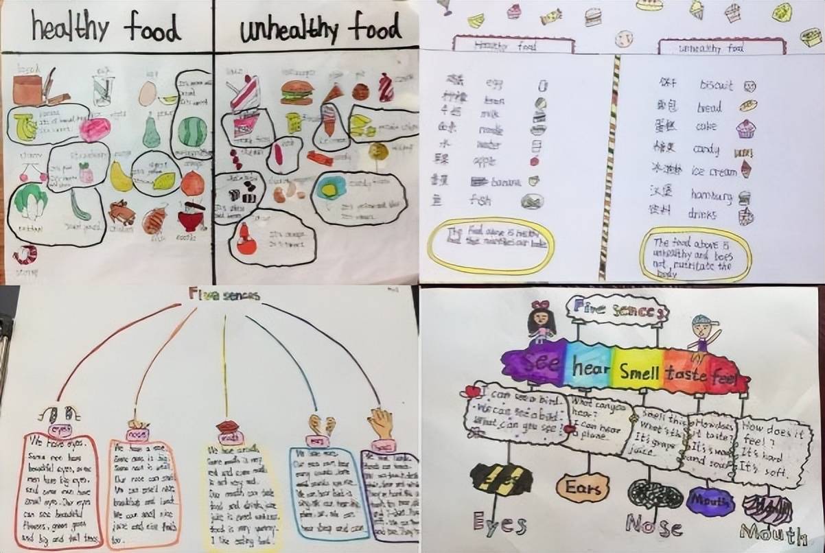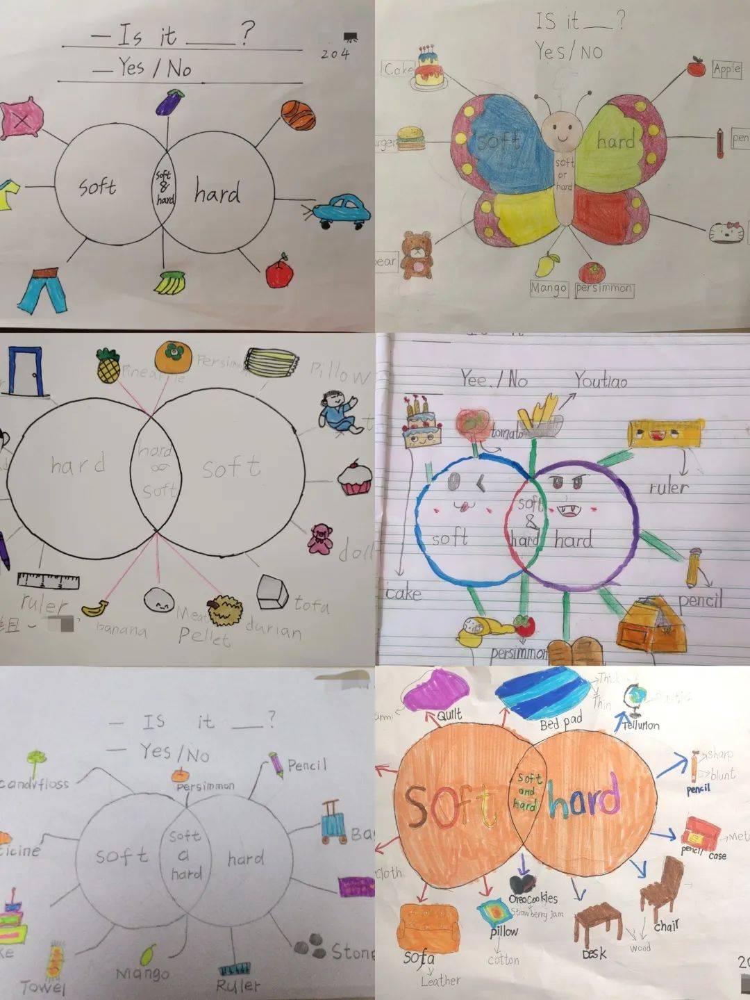 当前英语学习多以记忆单词为主,机械、重复的作业不仅无法有效帮助学生巩固所学知识,还容易引起学生的厌倦心理与抵抗情绪。基于此,英语组老师们充分利用学生爱好绘画这一特点,尝试通过思维导图的形式,在增强作业趣味性的同时,也帮助学生形成知识网络。例如,一年级老师们尝试让学生将绘本学习转化为思维网络;二年级老师们在教授2B Unit 2 Touch and feel一课时,由于无法让学生现场触摸老师的教具,干脆让学生观察家中物品,对家中物品进行soft or hard的分类,同时引导学生思考soft、 hard的相对性。