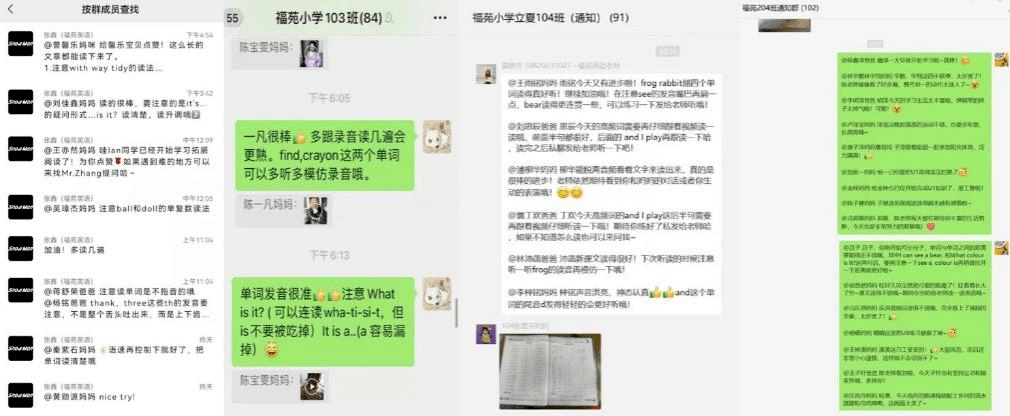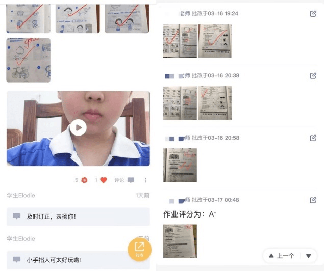 作业评价的意义在于“了解学生、帮助学生、激励学生”,是作业活动的重要组成部分,对有针对性地改进教学设计、提升学生的英语学习能力都具有重要意义。为了让线上作业布置落地、让学生收到来自老师“隔空”的监督,福苑小学英语组的老师们充分利用云端优势,最大化实现“一对一”与“一对多”的个体评价与集体评价相结合的评价方式,通过一场场师生之间别开生面的“座谈会”,助力优化作业设计,有效推进教学目标达成。