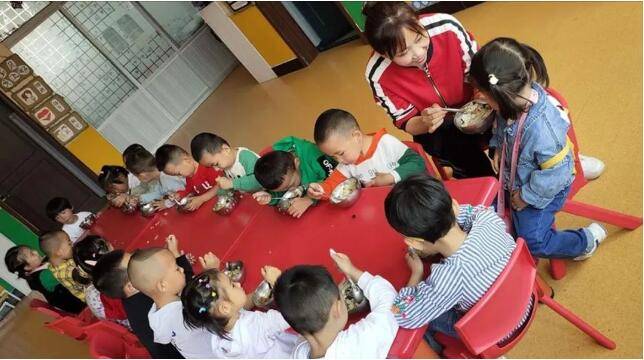 到了午餐时间,更尴尬了,孩子平时都是爷爷奶奶喂的饺,孩子不会自己吃饭。