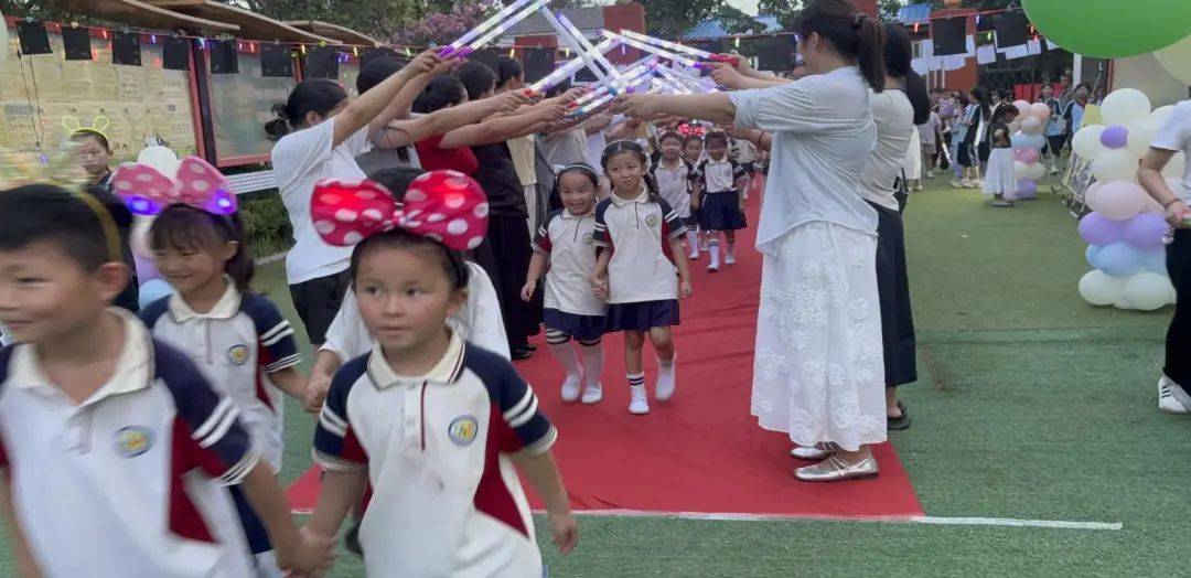 伴随着轻柔的音乐,幼儿缓缓走过由气球与照片装点的红毯长廊,家长们手举荧光棒为孩子搭起一条成长之路,在爱的呵护下,孩子们正稳步迈向人生的新阶段。