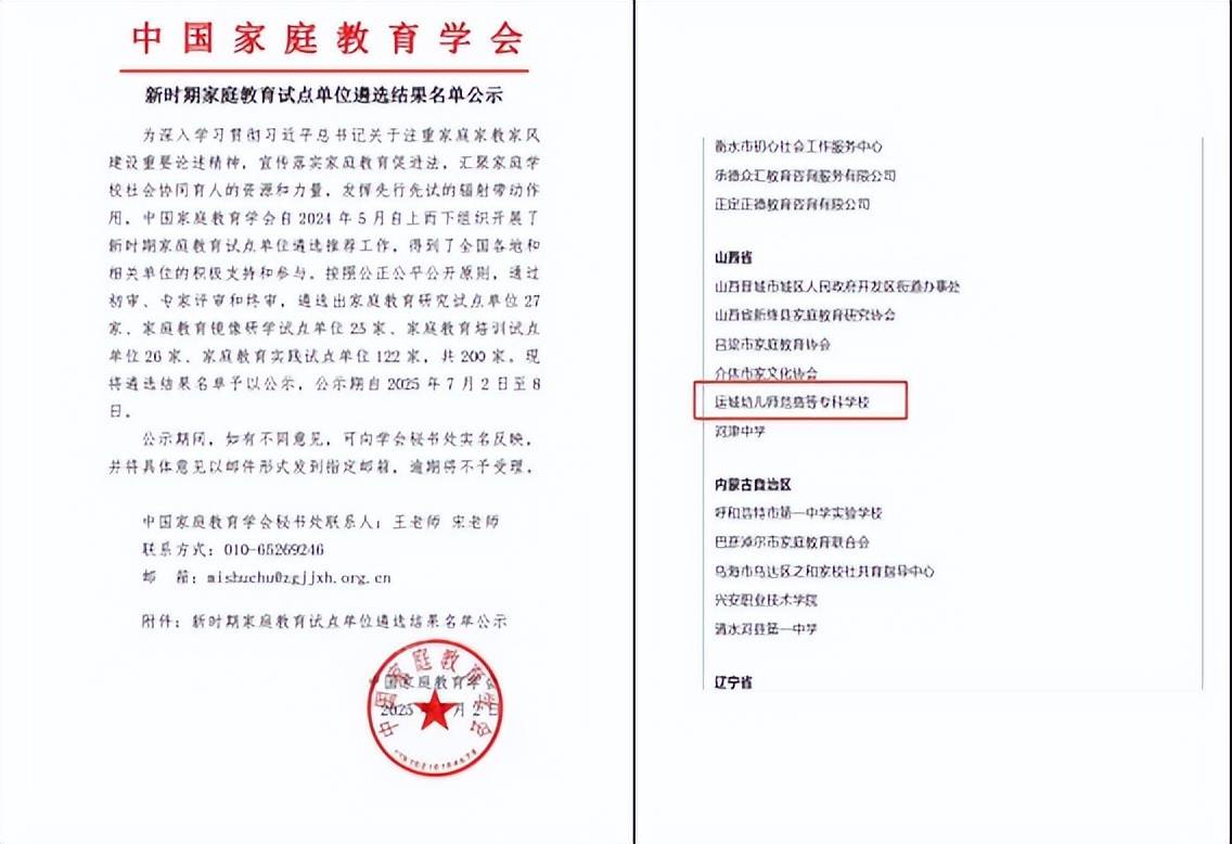 近日,中国家庭教育学会公布了新时期家庭教育试点单位遴选结果,运城幼儿师范高等专科学校成功获批“实践试点单位”,这标志着该校在家庭教育领域的专业建设与实践探索获得了权威认可,迈入了崭新发展阶段。