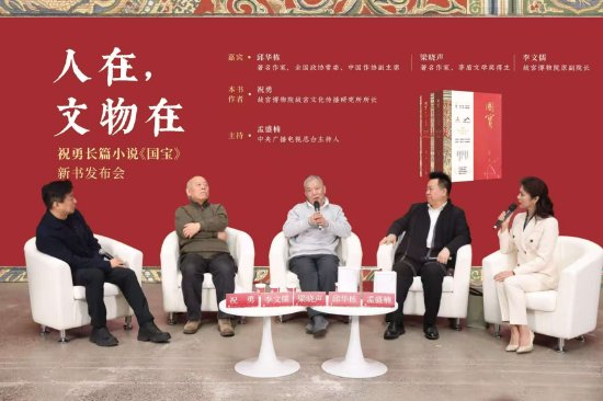 2025年2月22日,人民文学出版社隆重推出作家祝勇的最新长篇小说《国宝》,并于红楼公共藏书楼举办了以“人在,文物在”为主题的新书发布活动。中国作家协会党组成员、副主席、书记处书记邱华栋,著名作家、茅盾文学奖得主梁晓声,故宫博物院原副院长李文儒及本书作者祝勇一起展开了一场精彩的对话。活动由中央广播电视总台孟盛楠担任主持,中国出版集团党组成员、中国出版传媒股份有限公司副总经理、人民文学出版社社长臧永清也出席了发布会。