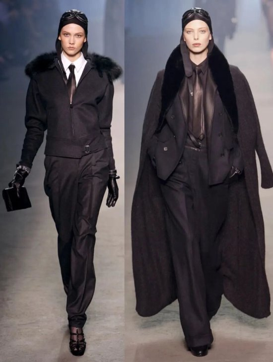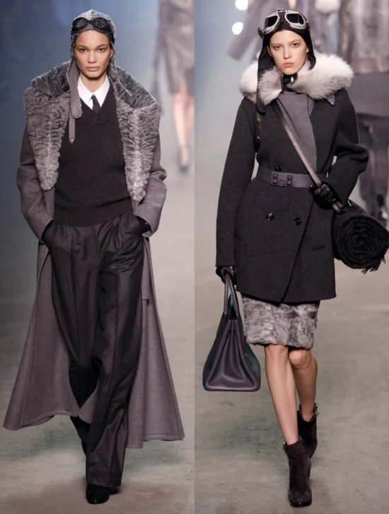 在Hermès2009年秋冬系列的发布会上,设计师Jean Paul Gaultier以女飞行员的秀场形象向二战后的女性英雄Amelia Earhart和 Amy Johnson致敬,飞行帽与短夹克成为这场时尚盛宴的造型基因,充分释放了爱马仕标志性奢华皮革的无限可能。
