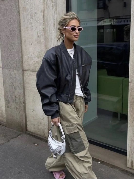 值得注意的是,今年流行的飞行夹克板型不再局限于传统短款。Oversize廓形、拼接面料以及亮色款式都成为热门。例如,浅粉、薄荷绿等意想不到的色彩,让飞行夹克突破了“沉闷秋冬”的局限,带来清新活力。