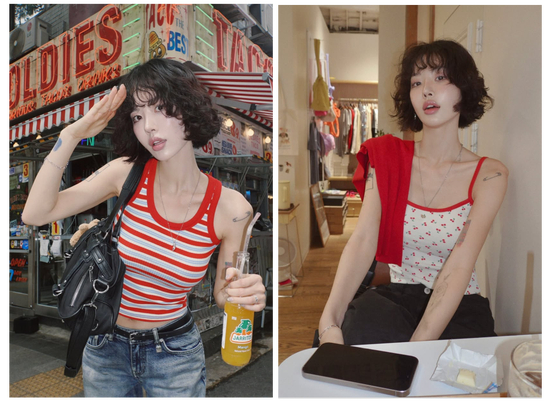 相比粗条纹,细条纹与吊带背心更加“般配”,细条纹自带视觉收缩效果,能很好地展现上身的优美曲线。而带有小巧可爱图案点缀的款式,星星点点的布局像灵动跳跃的韵律,为简约的吊带增添趣味细节。