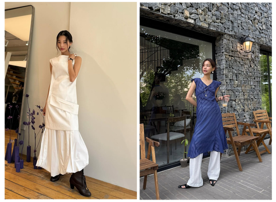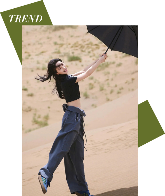 A字形长裙能勾勒出上身纤细线条,而下半身宽松的廓形则赋予身体充足的空间,尝试内搭一条微喇长裤,裤型流畅地延伸,与裙摆形成层次叠穿。这种搭配不仅修饰身形,更能碰撞出独特的松弛氛围。