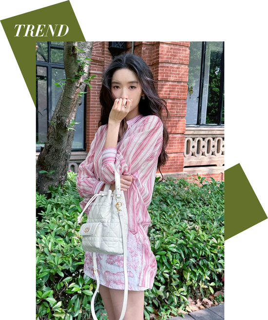 想要“偷懒”穿得时髦,用低饱和色彩和经典的图案营造氛围感,也是不错的选择。王玉雯上身的这件粉色条纹衬衫,清新又甜美,再搭配一条同色系的粉色印花短裤,上下呼应,色彩和谐统一,全身散发出轻盈的少女气息。