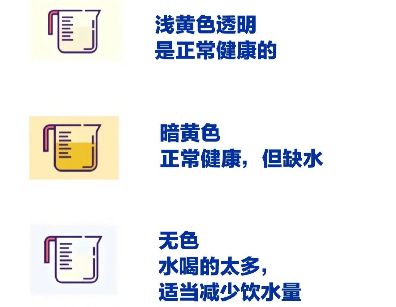 - 观察尿液颜色,淡黄为宜,太黄说明喝水不足。