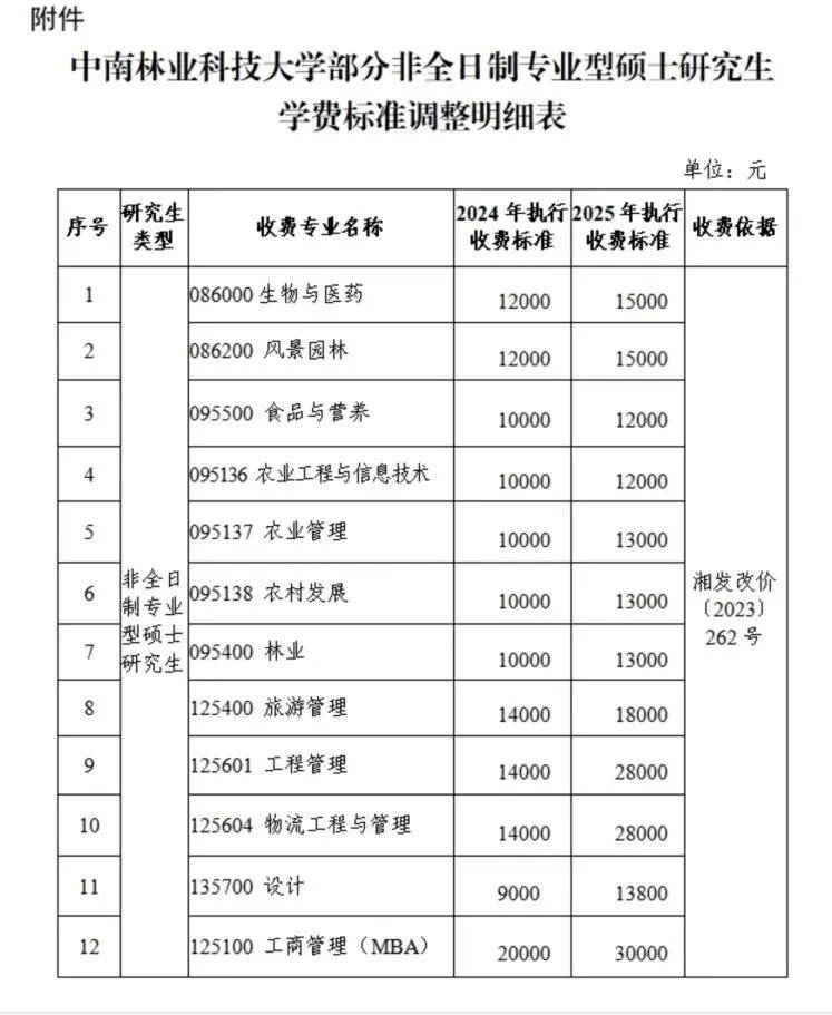 非全日制研究生学费涨幅更为显著。中南林业科技大学将工程管理和物流工程与管理专业的学费从1.4万元/年上调至2.8万元/年,直接翻倍。校方回应称,这次调整经过调研、成本测算和上级备案,流程“严格合规”。