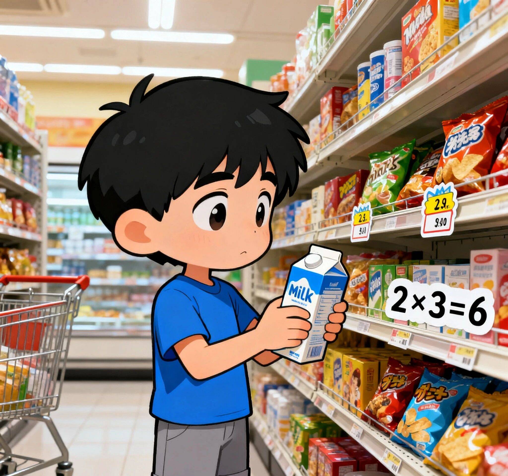 ①、带孩子去超市时,可以问“一盒糖果8元,买3盒要多少钱?”