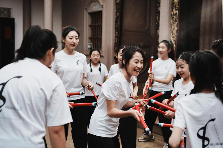 在《英歌向未来》的创作期间,为了让孩子们有更专业更优秀的学习平台,少年宫以科学规范的创作要求,开设了“非遗+音乐剧”系列专业特色课程:不仅邀请汕头潮阳区后溪英歌队资深英歌舞教练亲自授课,让青少年近距离学习传统技艺;还组织孩子们前往广东汕头进行非遗采风,感受英歌舞的文化底蕴;更邀请国内戏剧界专家全程参与制作,从剧本打磨到舞台呈现,每一个细节都经过专业指导。这些举措让非遗传承从书本走向实践,让青少年在沉浸式学习中提升审美素养与人文情怀,正如剧中断裂后修复的 “英歌槌”,少年宫的美育沃土,让文化传承的希望在青少年心中生根发芽。