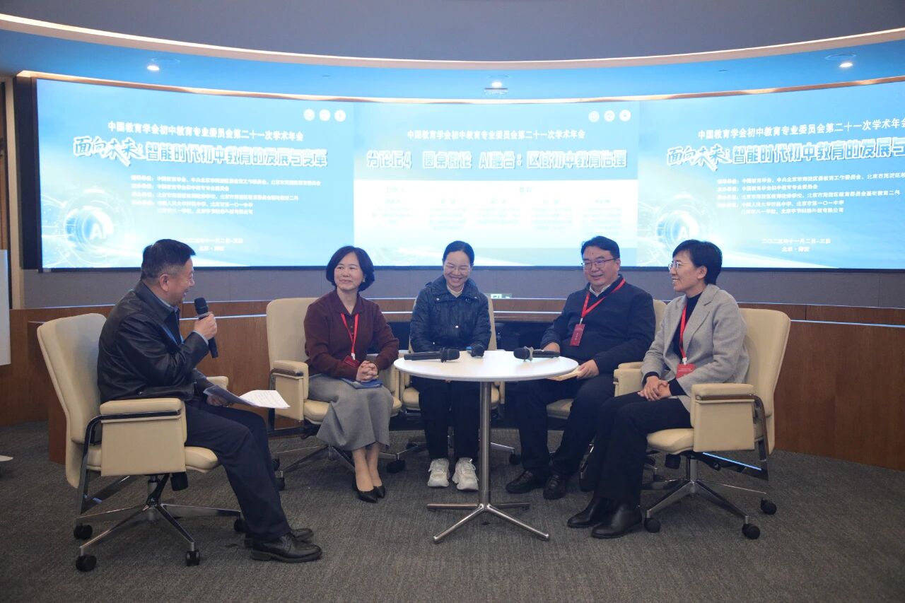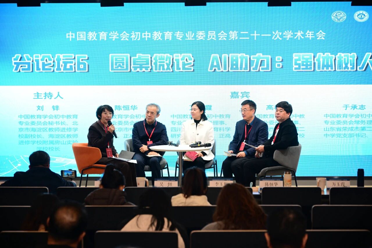 圆桌微论聚焦“AI赋能:教师专业发展”主题,由赵群筠副秘书长主持。中国教育学会初中教育专业委员会副理事长、深圳市福田区教科院原院长郭其俊,中国教育学会初中教育专业委员会常务理事、上海师范大学国际与比较教育研究院副教授朱小虎,中国教育学会初中教育专业委员会理事、北京市通州区教师研修中心党委书记、主任(院长)孙翠松,中国教育学会初中教育专业委员会常务理事、北京市海淀区教师进修学校教研员支瑶4位论坛嘉宾围绕“从‘工具’到‘伙伴’:AI如何重塑教师的日常教学与专业成长”和“AI时代教师的‘变’与‘不变’:核心素养与角色转型的关系”两个话题展开深度交流。几位专家提出:AI虽改变了教学的方式,但教师对学生成长的精神引领始终不变,教育的未来在于教师对AI的理性接纳与主动选择,倡导教师在人机协同中坚守育人本质,培养学生“学会学习”的核心能力,推动教师从知识传授者转向学习引导者。
