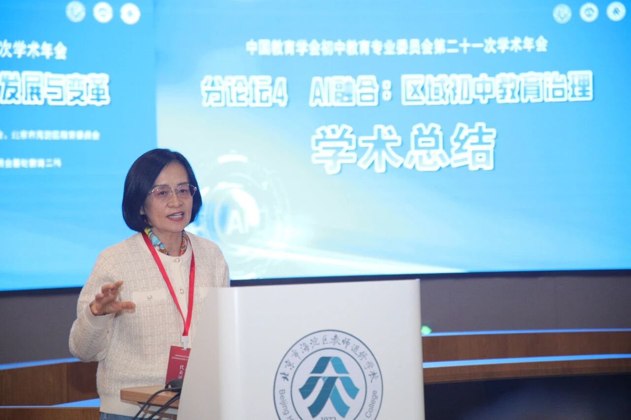 中国教育学会初中教育专业委员会副理事长、上海市徐汇区教育学会会长李文萱做学术总结。李文萱会长分享了两点体会:第一,AI与区域初中教育治理的融合是一场深刻的理念重塑、体系重构和流程再造的范式变革。四个区域案例体现了四点共性:一是理念从经验驱动转向数据智能驱动,实现多维度治理;二是定位为区域教育智慧大脑和神经中枢;三是任务是构建以数据为核心、AI为驱动的治理新体系,追求教育公平和质量提升;四是路径上从本地实际出发,分阶段推行。第二,智能时代的初中教育需要处理好坚守与蝶变的辩证关系。坚守核心价值观、教育规律和人的主体性,蝶变则涉及理念、模式、工具和评价的变革,二者协同方可构建有温度的智慧教育新生态,助力初中教育行稳致远。