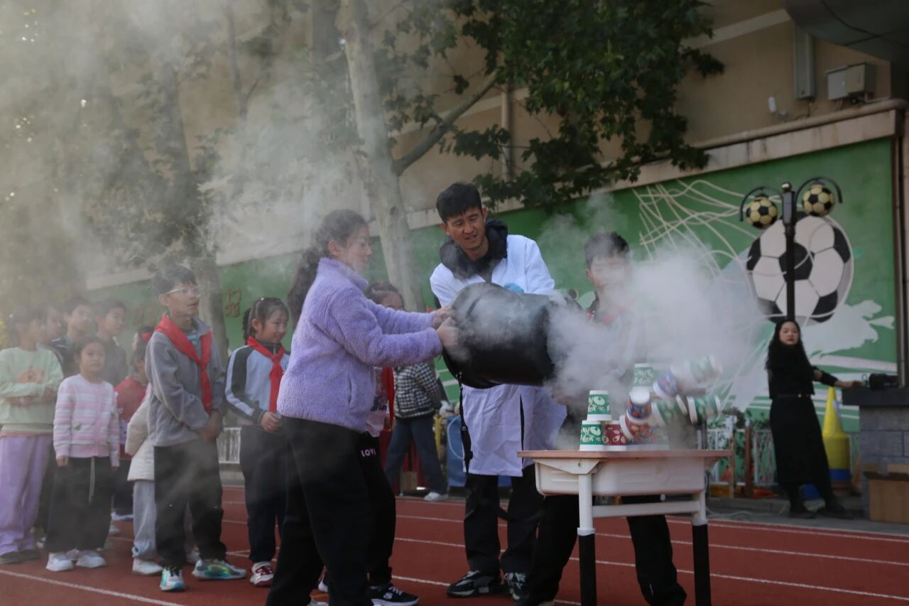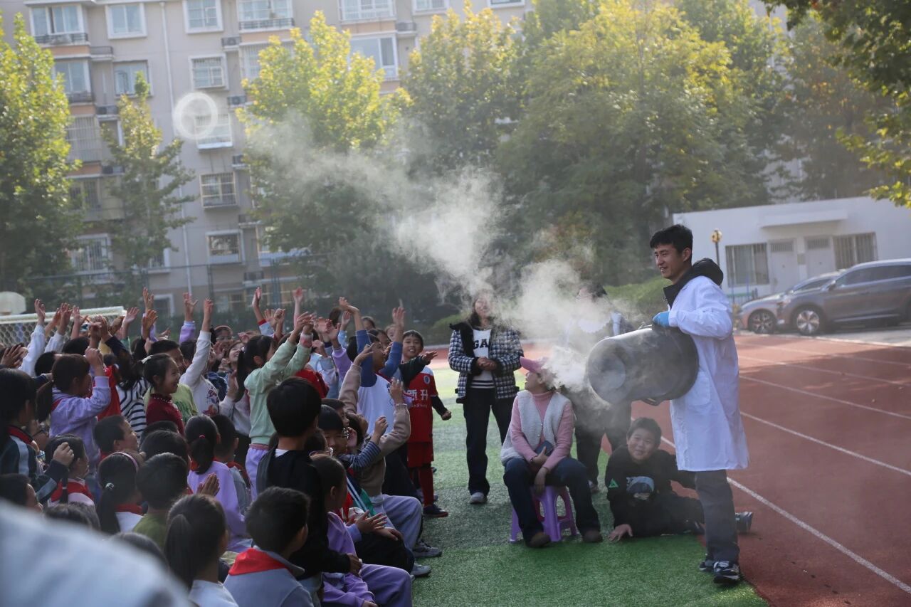 紧随其后,来国星老师的“烟雾大炮”更是引爆全场!一声巨响,一团白色烟雾如炮弹般精准“发射”出去,在空中划出一道神秘弧线。同学们瞪大双眼,兴奋地欢呼:“太酷了!科学真神奇!”