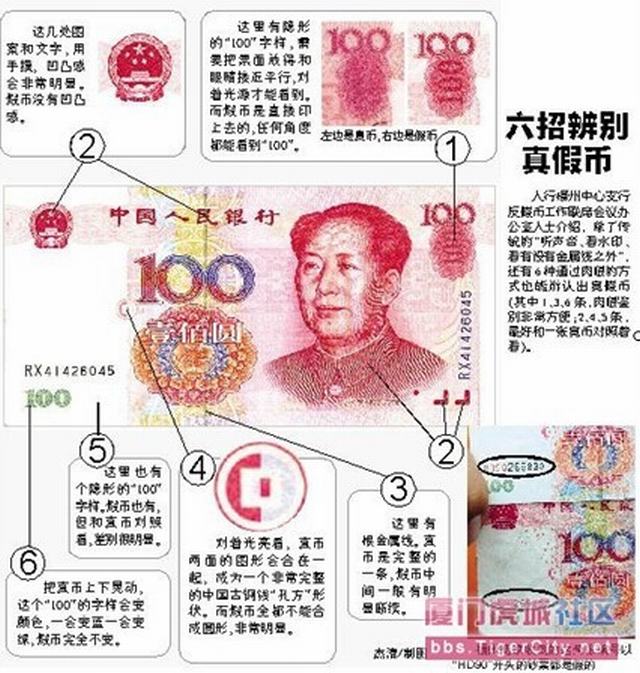 假钞的印刷工艺大多是胶印、丝网等平印,质量很差。有些假钞为模仿真钞的凹印效果,在人像衣服、团花及手感线等凹凸位置用坚硬金属磨具进行了压痕处理,触摸有凹凸效果,应仔细观察。