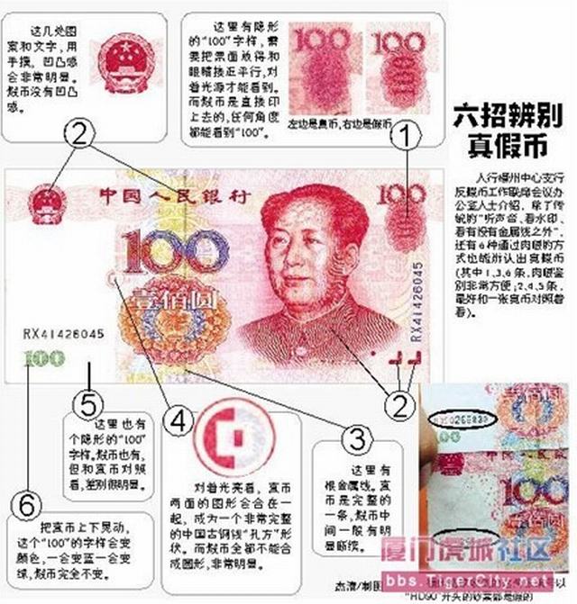 并且其“花卉水印”技术很高,迎光清晰可见(平视不可见);纸张较光滑,但不如真币硬实,轻轻抖动声音不如真币清脆。