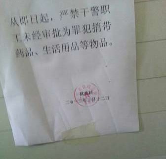 “从即日起,严禁干警职工未经审批为罪犯捎带药品、生活用品等物品。”记者近日实地探访铁岭监狱,见到会见室墙上赫然贴着这样一张通知,落款为“辽宁省铁岭监狱狱政科”,发布时间为2013年3月12日。