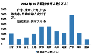 另外,到医院就医人数的增长率仍高于到基层医疗卫生机构就医人数的增长率,是导致医院人满为患的又一原因。2013年10月份,全国医疗卫生机构诊疗人次达5.9 亿人次,同比提高8.8%,环比提高1.0%。其中,医院2.2 亿人次,同比提高10.3%,环比提高1.9%;基层医疗卫生机构诊疗人次为3.5 亿人次,同比提高7.7%,环比提高0.4%;其他机构0.2 亿人次。