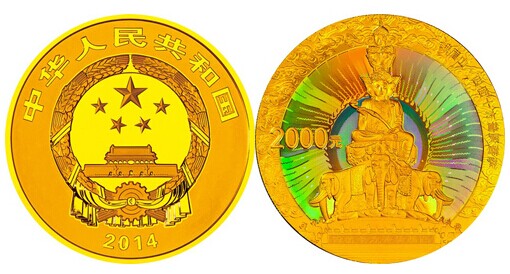 中国四大佛教圣地系列峨眉山金银币是第三组,2014年3月21日,中国人民银行面向全球发行中国佛教圣地(峨眉山)金银纪念币一套。 该套纪念币当中,最引人注目的品种无疑是5盎司幻彩金币。峨眉山5盎司十方菩萨金币采用了幻彩工艺,这也是我国发行的第一枚5盎司幻彩金币。