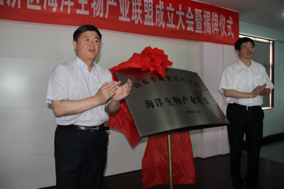 2014年6月17日,山东半岛蓝色经济区海洋生物产业联盟揭牌仪式在青岛举行,标志着全省海洋优势产业首个联盟宣告正式成立,这也体现了海洋生物产业的优势地位和在整个海洋产业发展方面的龙头带动作用。山东省委政策研究室副主任郝宪印,省财政厅副厅长文新三,省人力资源和社会保障厅副巡视员魏兴隆,省区域发展战略推进办公室副主任关兆泉,青岛市政府副秘书长陈勇,市发改委副主任、市蓝色经济区建设办公室主任任振刚等领导、专家、企业家出席会议。关兆泉、陈勇共同为联盟揭牌。中国工程院院士管华诗、麦康森还专门向联盟成立发来了贺信。