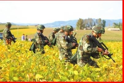 数百名全副武装、荷枪实弹的武警官兵从军车下来后集结,形成合围,准备向玉米地方向挺进搜索。